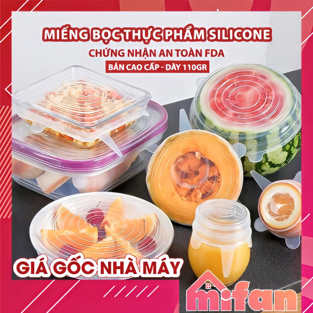 Freeship- Bộ 6 Miếng Silicone Bọc Thực Phẩm Cao Cấp MIFAN - Nắp đậy màng Silicon bảo quản thức ăn Dày Dặn Độ Co Giãn Tốt mua tại đây